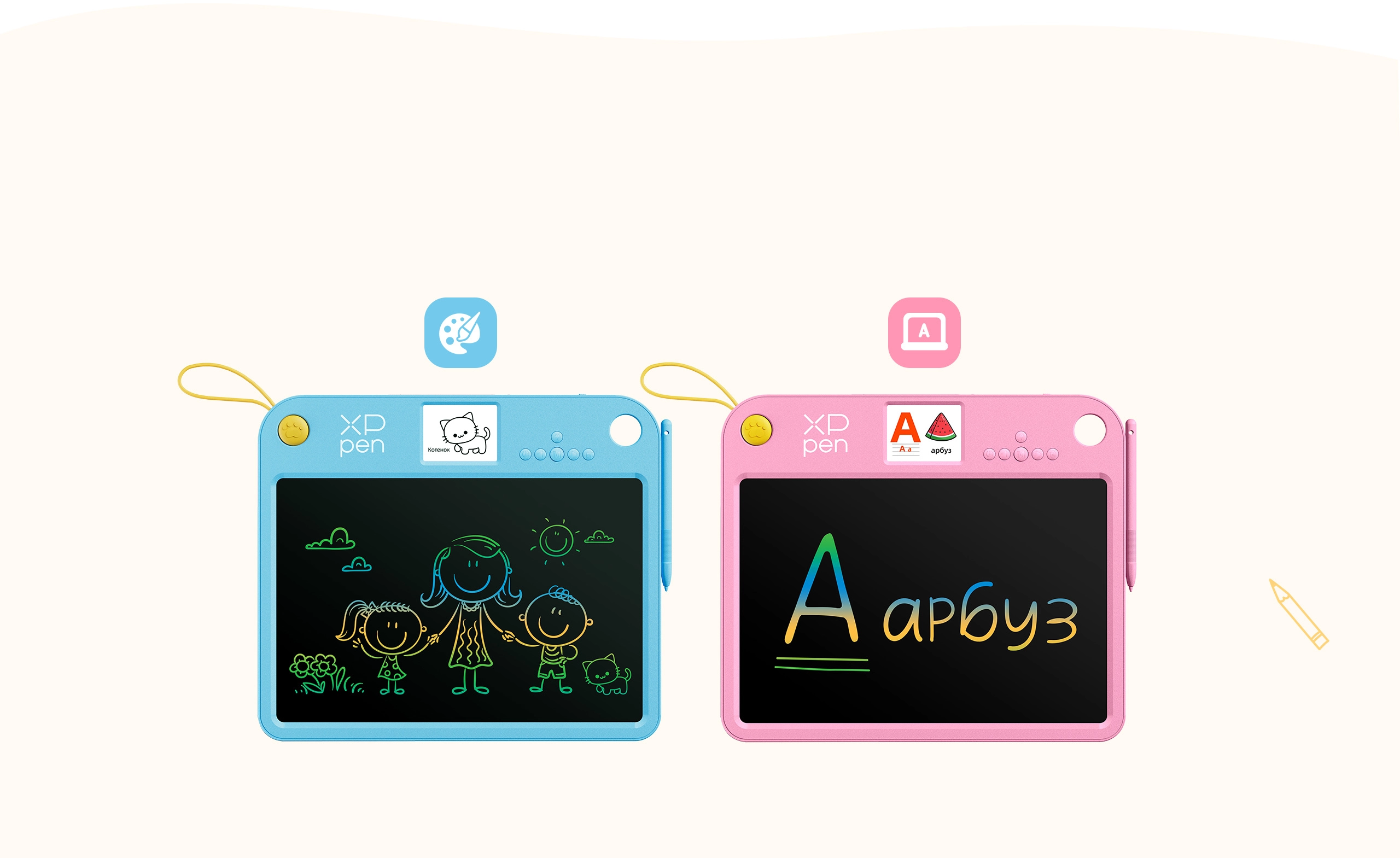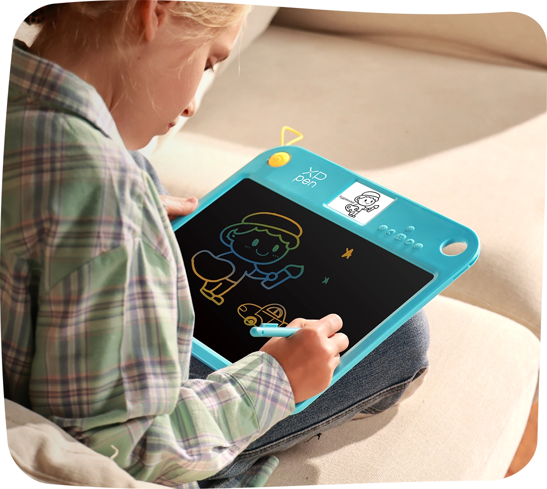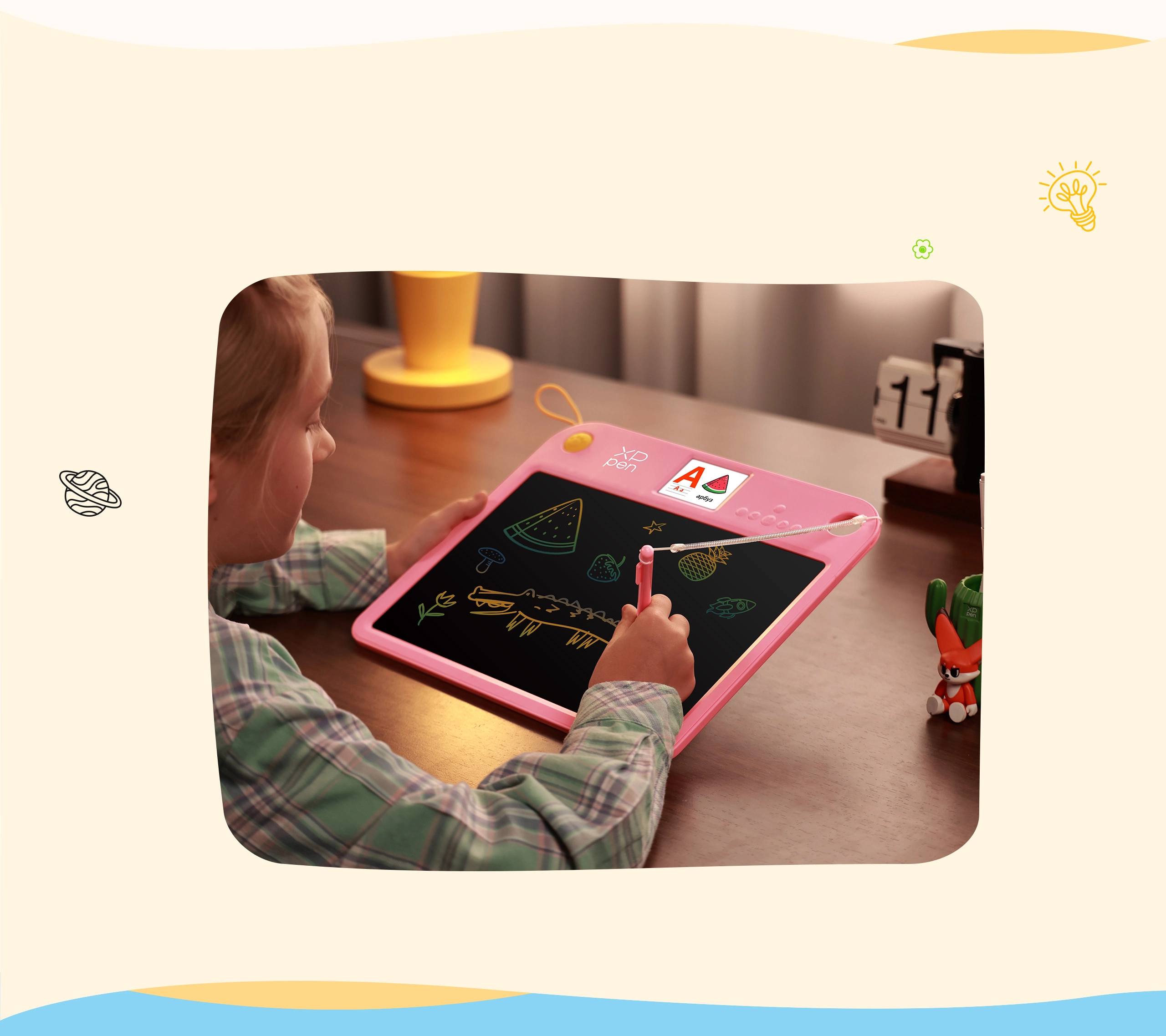 Рисование яркими цветами на обучающем планшете XPPen Doodle приносит детям безграничное удовольствие. Лёгкий и безопасный для детей дизайн делает его удобным и портативным, позволяя рисовать где угодно.