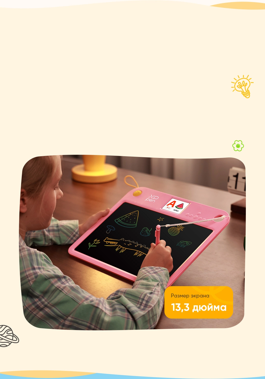 LCD-экран 13,3 дюйма предоставляет достаточно пространства для рисования. У планшета отсутствует подсветка, а чёрная подложка устраняет синий свет, блики и излучение, защищая зрение ребёнка.