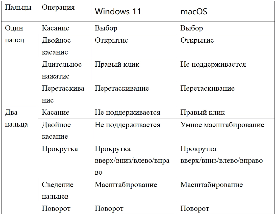 Основные жесты включают касания одним и двумя пальцами. Основные жесты позволяют навигацию по системе, выполнение кликов мыши, прокрутку, масштабирование или поворот.