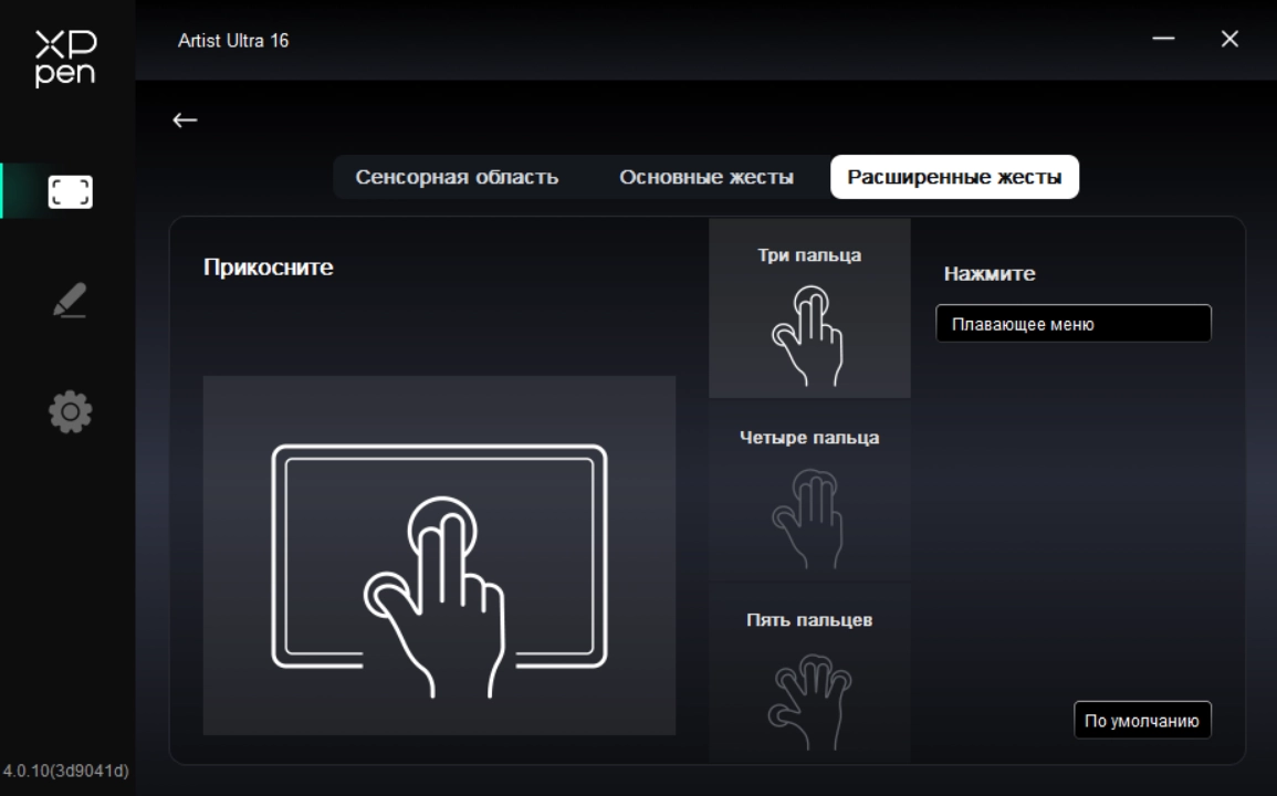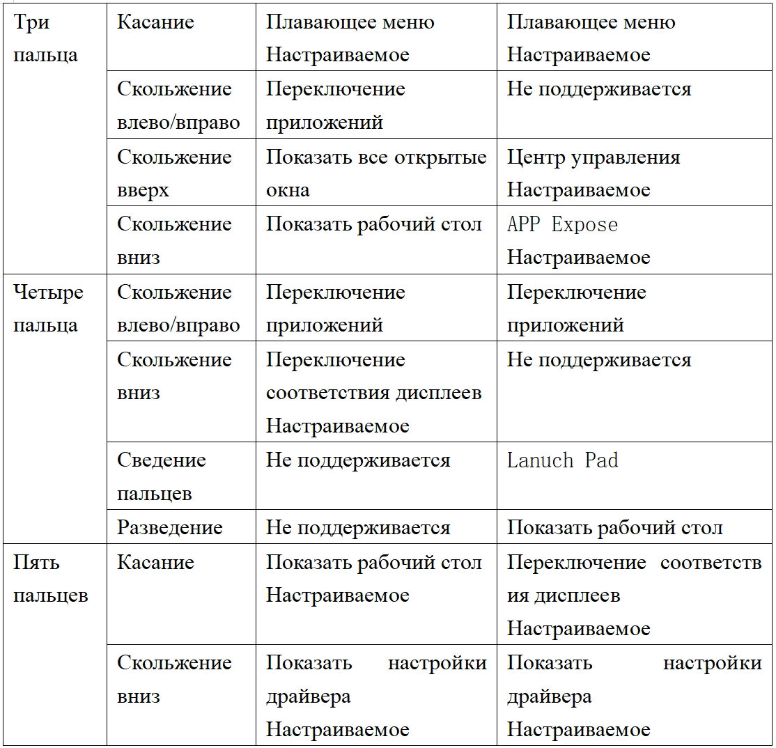 Расширенные жесты включают жесты тремя, четырьмя и пятью пальцами. Продукт поддерживает стандартные многопальцевые жесты или пользовательские жесты через выпадающее меню.