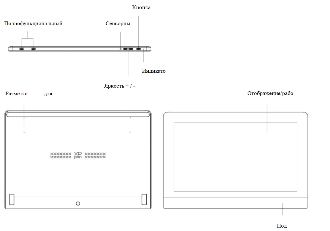 В режиме графического планшета — удерживать кнопку питания 3 секунды, индикатор попеременно мигает синим и оранжевым, устройство переходит в режим графического планшета. Повторное нажатие кнопки питания для возврата в обычный режим