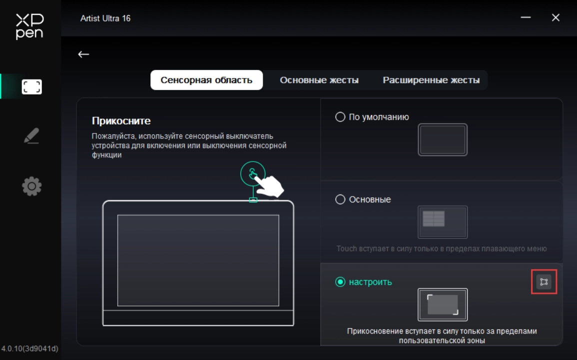 Продукт поддерживает переключение между тремя областями касаний: по умолчанию, основная и пользовательская.