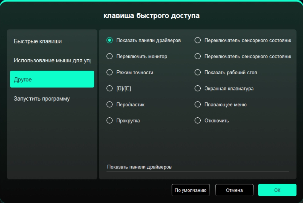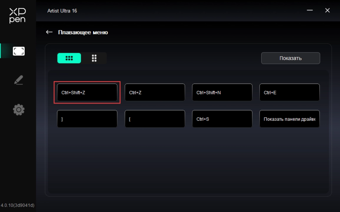 Плавающее меню может отображать плавающие горячие клавиши на интерактивном дисплее или мониторе компьютера. Можно настроить часто используемые операции в плавающем меню, затем использовать стилус, мышь или касание для нажатия кнопки и выполнения заданной операции. Можно войти на страницу плавающего меню через кнопку «Плавающее меню» на главной странице драйвера для настройки способа отображения и функций.