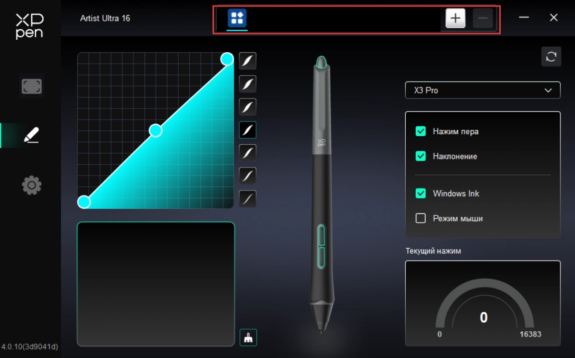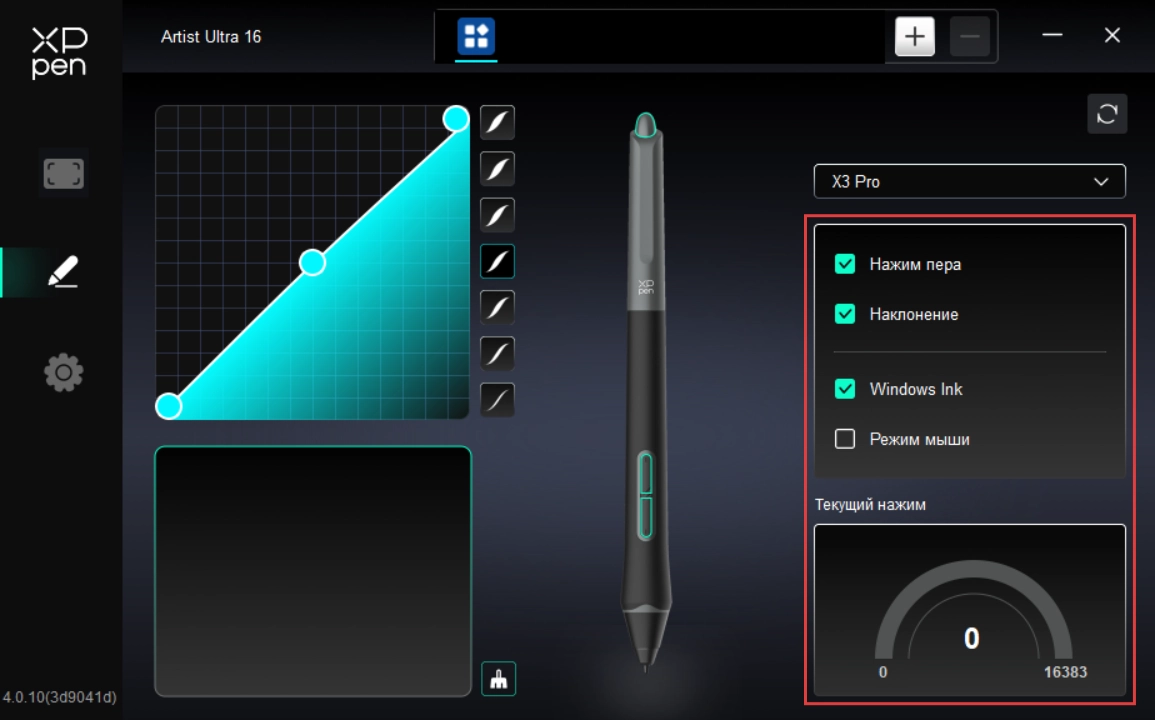 6) Если давление стилуса в драйвере нормальное (Windows: убедиться, что Windows Ink включен в настройках стилуса драйвера), запустить программное обеспечение для цифрового искусства и протестировать снова.
