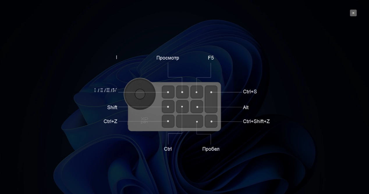 Просмотр функций используемой группы клавиш. Если в драйвере выбрана неактивированная группа клавиш, по умолчанию используются функции клавиш группы I. Нажать значок закрытия в правом верхнем углу для закрытия окна предпросмотра.