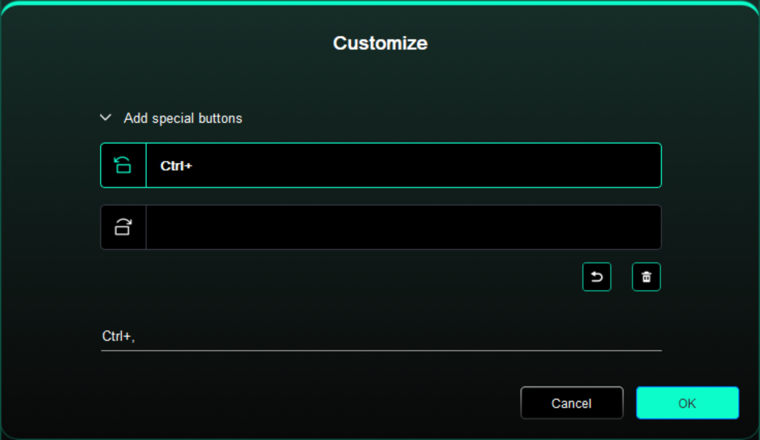 Нажмите на положение колеса управления на изображении, выберите "Настроить" из выпадающего меню предустановленных функций и настройте функции колеса управления по часовой и против часовой стрелки, вводя желаемые клавиши или комбинации клавиш на клавиатуре.