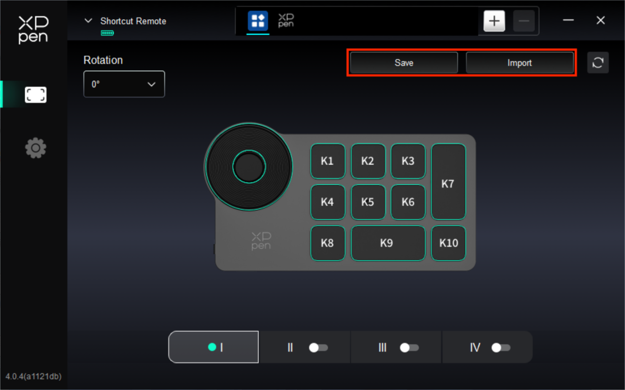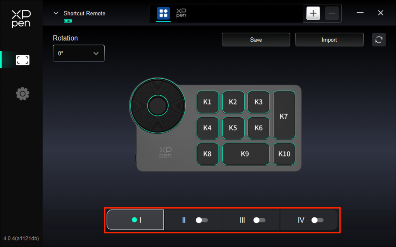 Драйвер предоставляет четыре группы горячих клавиш. Первая группа горячих клавиш используется по умолчанию (не может быть отключена). Каждая группа кнопок может быть пользовательски настроена для различных функций. После включения можно переключаться между включенными группами с помощью "I/II/III/IV" (по умолчанию используется кнопка K1, которую можно настроить как другие кнопки).