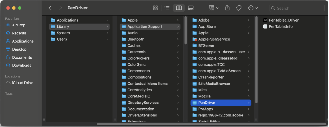 При отсутствии PenTablet_Driver в списке, перейдите в Библиотека ресурсов -> Application Support -> PenDriver, и добавьте драйвер вручную.