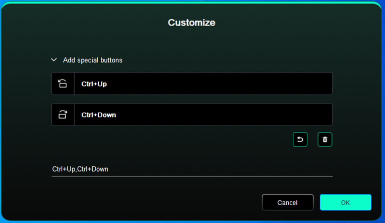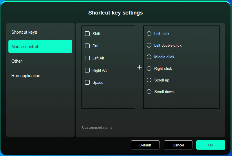 Нажмите на положение колеса управления на изображении, выберите "Настроить" из выпадающего меню предустановленных функций и настройте функции колеса управления по часовой и против часовой стрелки, вводя желаемые клавиши или комбинации клавиш на клавиатуре.