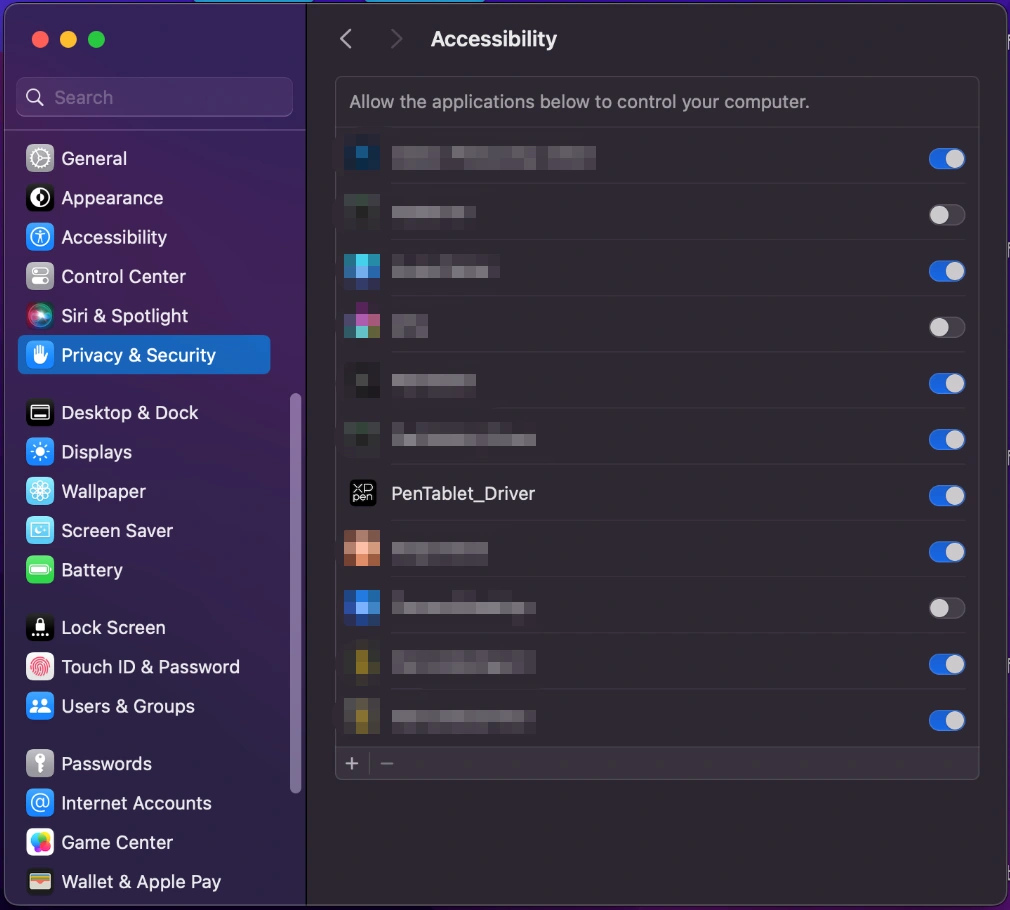 Распакуйте файл, запустите файл "dmg" и следуйте инструкциям для завершения установки. Перейдите в Настройки системы -> Конфиденциальность и безопасность -> Доступность; Беспроводные настройки: Настройки системы -> Конфиденциальность и безопасность -> Доступность и Bluetooth, убедитесь, что опция PenTabletDriver отмечена; В противном случае устройство и драйвер могут работать неправильно.