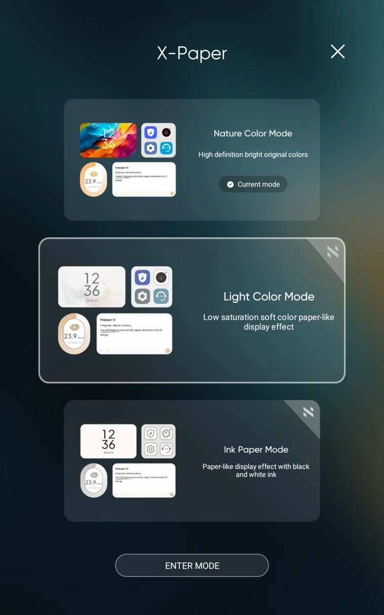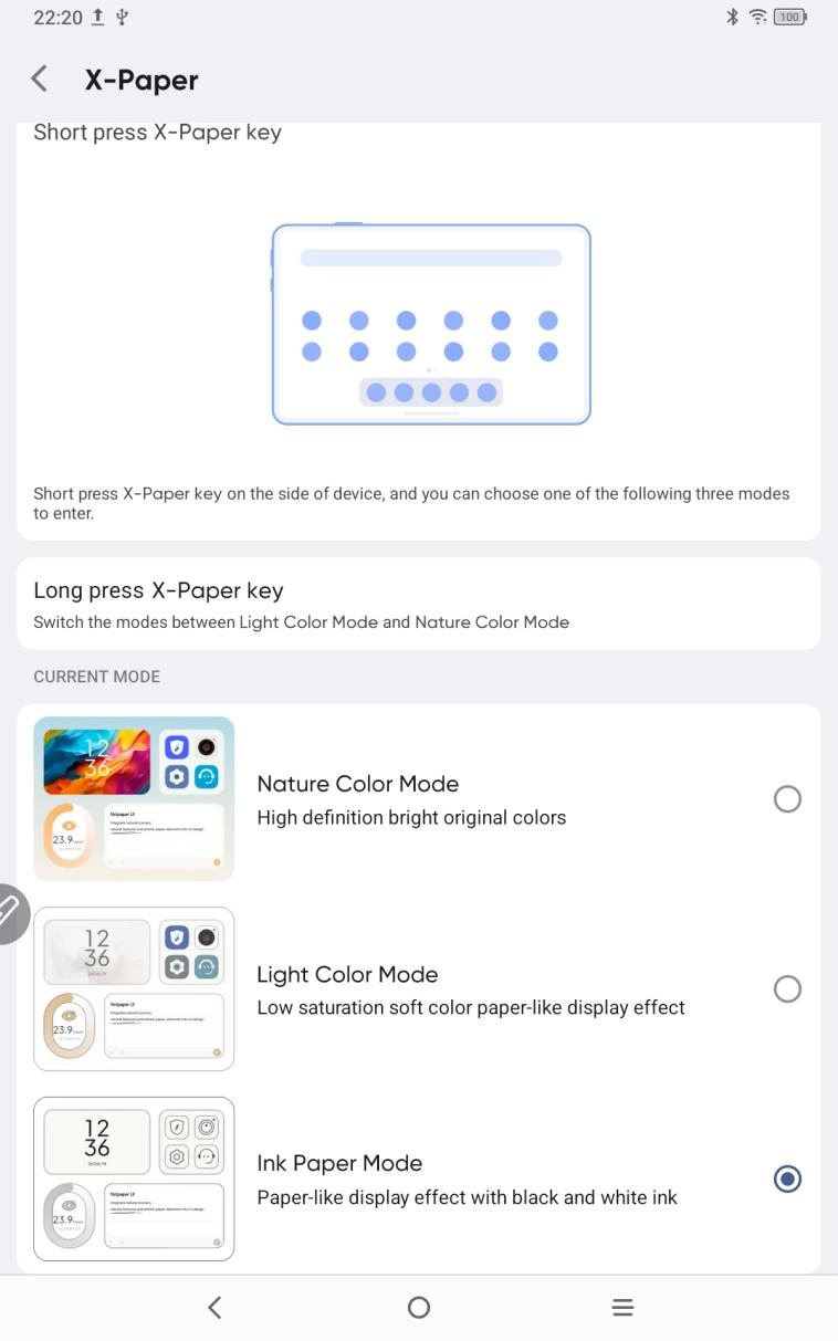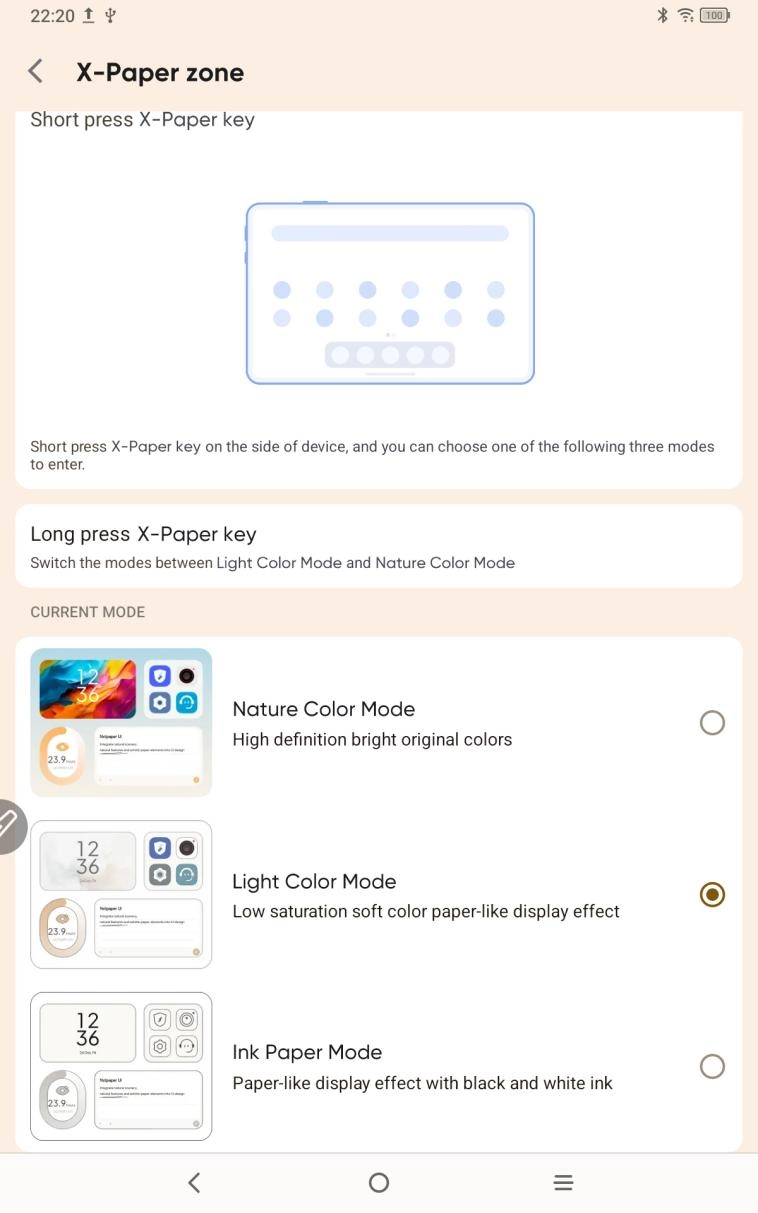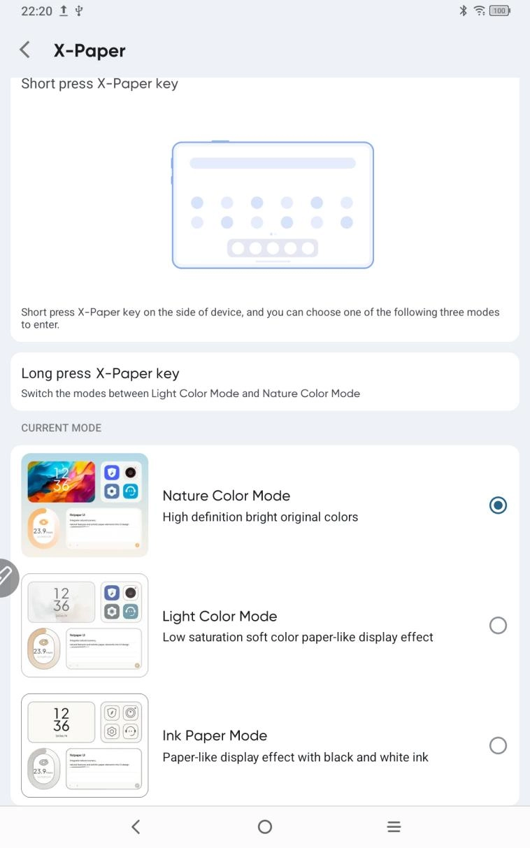 Примечание: Вы можете переключаться между режимом светлых цветов и режимом естественных цветов коротким нажатием клавиши X-Paper
