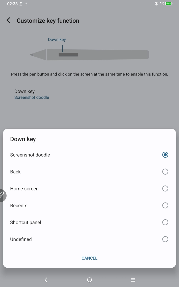 Нажав "Клавиша вниз", как показано на рисунке ниже, пользователи могут самостоятельно определить функцию кнопки пера.