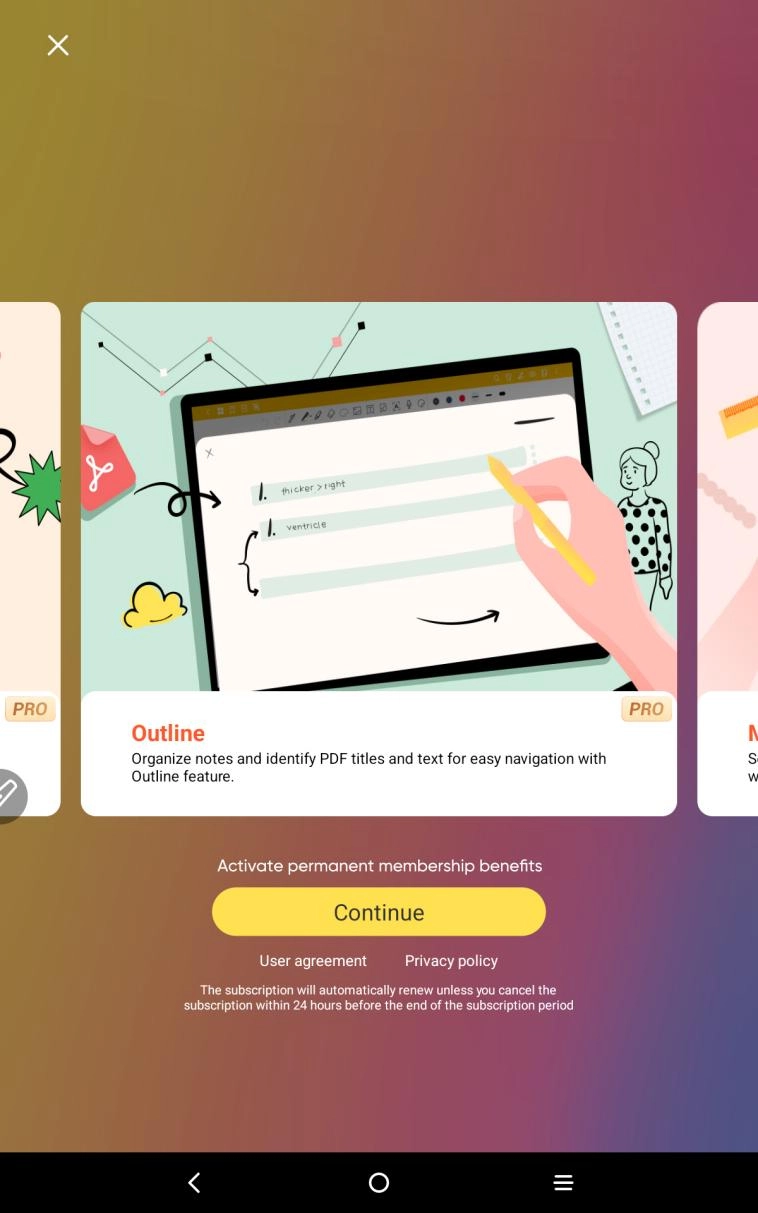 Шаг 3: При первом запуске приложения XPPen Notes на главной странице появится информация о покупке членства. Нажмите "Продолжить", как показано на следующем рисунке: